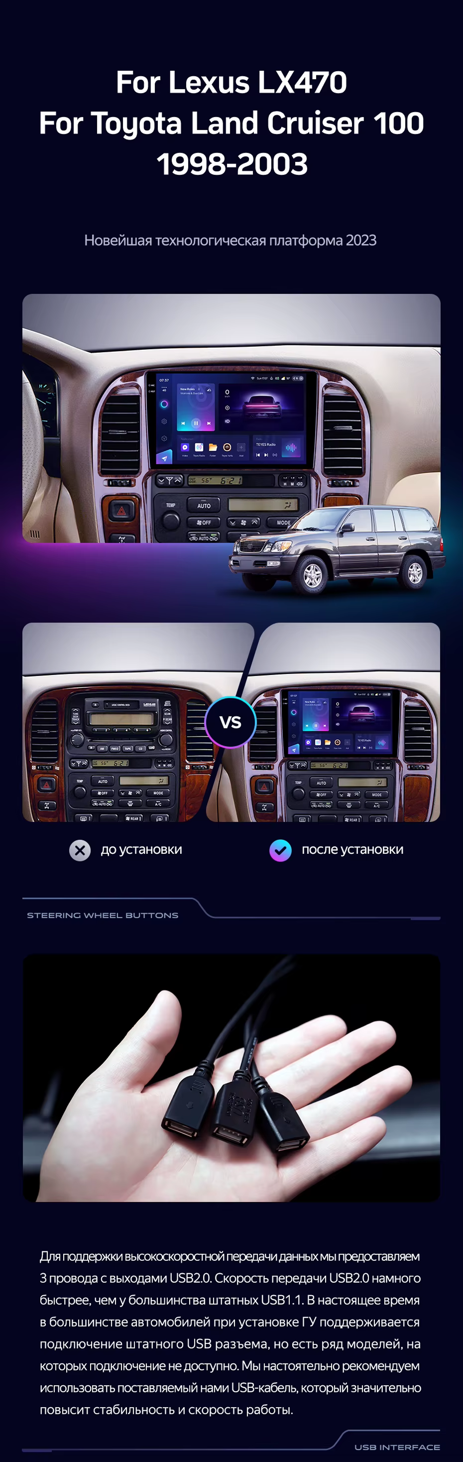 Полный комплект установки магнитолы Teyes с рамкой и проводкой можно выбрать в каталоге штатных магнитол Lexus LX470 (1998-2003).