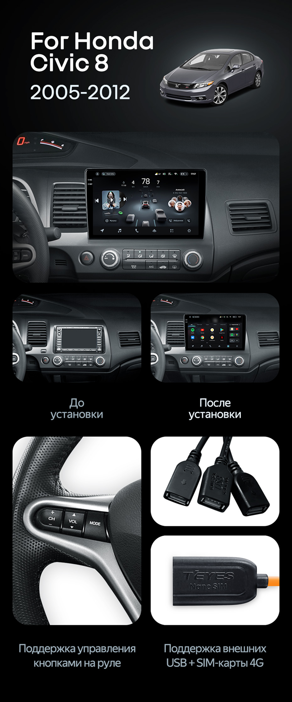 Штатная магнитола Teyes CC4 Pro 8/128 Honda Civic 8 FK FN FD (2005-2012) - купить всего за 65 600 руб. в интернет-магазине в Нижнем Новгороде Teyes.com.ru. ✓ Самый лучший выбор мультимедиа ✓ Лучшая замена штатному ГУ ✓ Тел. +7 (800) 775-31-74