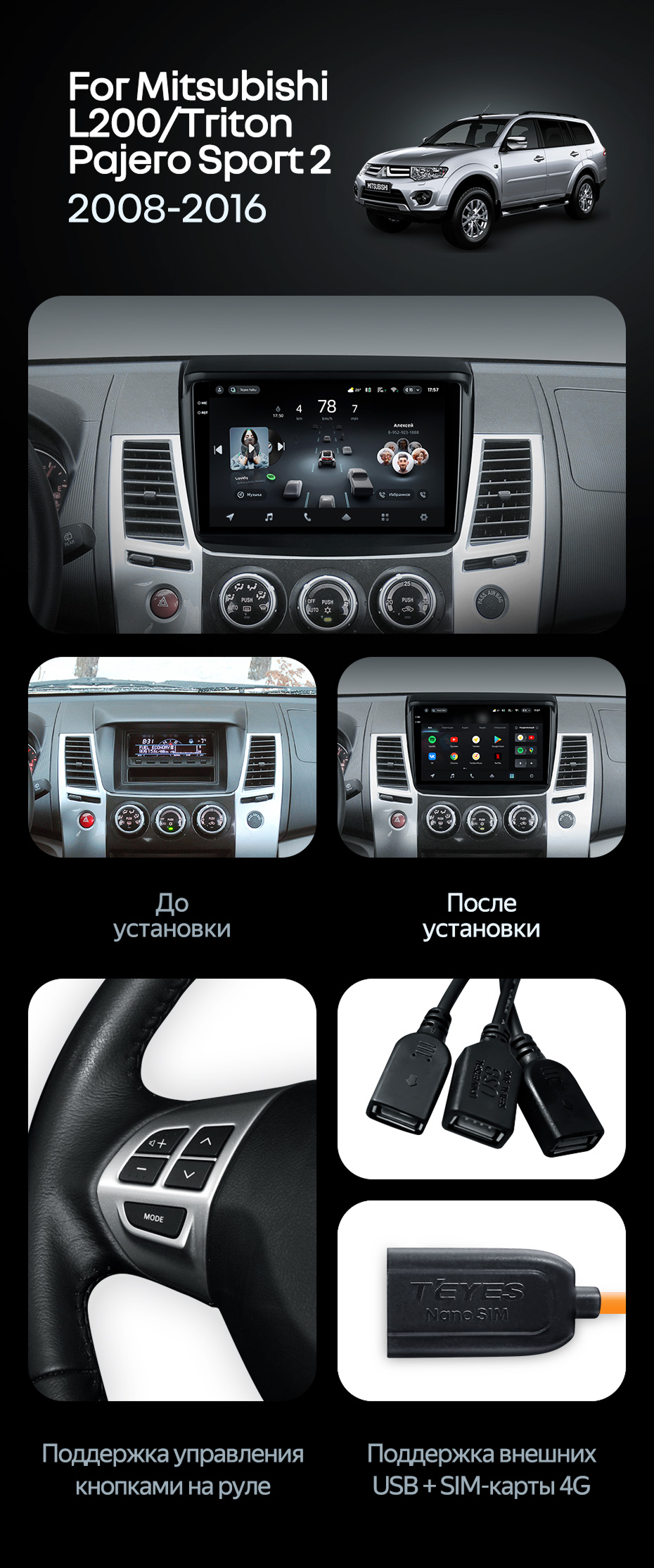 Штатная магнитола Teyes CC4 Pro 8/128 Mitsubishi Pajero Sport 2 (2008-2016) - купить всего за 63 870 руб. в интернет-магазине в Нижнем Новгороде Teyes.com.ru. ✓ Самый лучший выбор мультимедиа ✓ Лучшая замена штатному ГУ ✓ Тел. +7 (800) 775-31-74