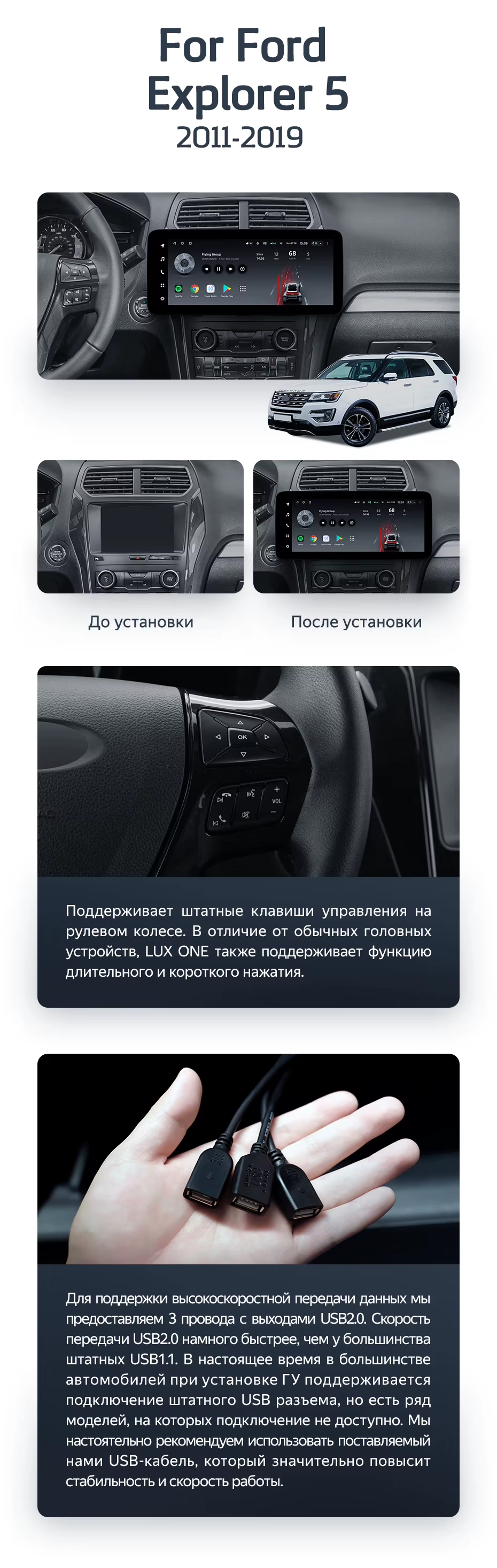 Установочный комплект для Ford Explorer 5 (2011-2019) включает переходную рамку и проводку.