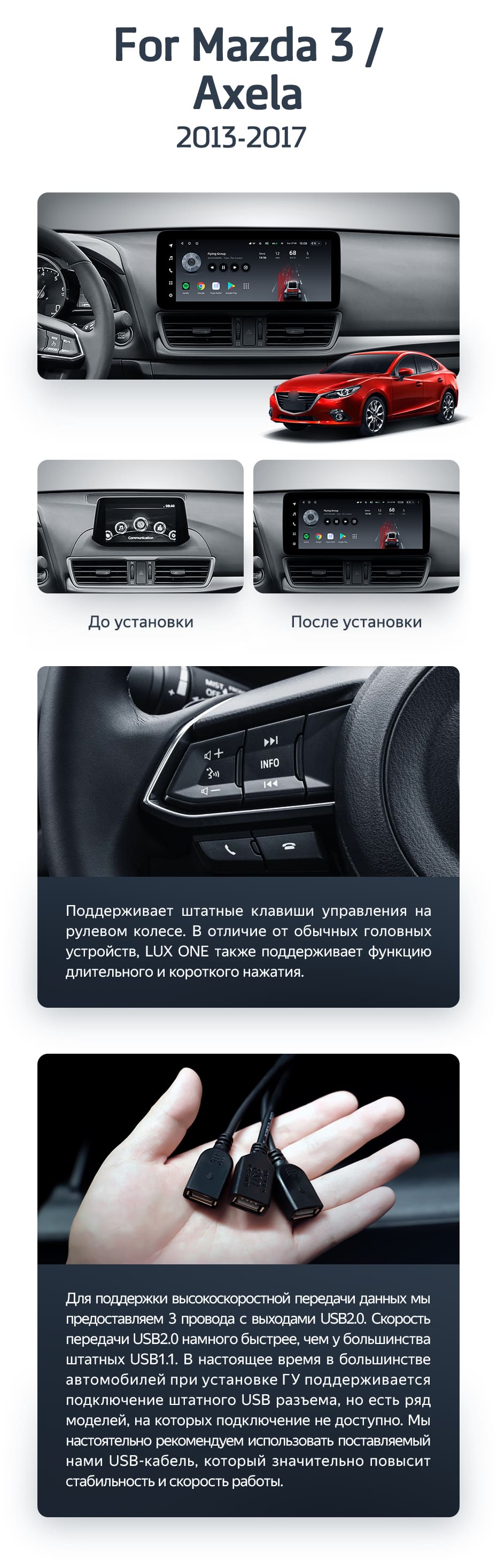 Полный комплект установки магнитолы Teyes с рамкой и проводкой можно выбрать в каталоге штатных магнитол Mazda 3 BM (2013-2017).
